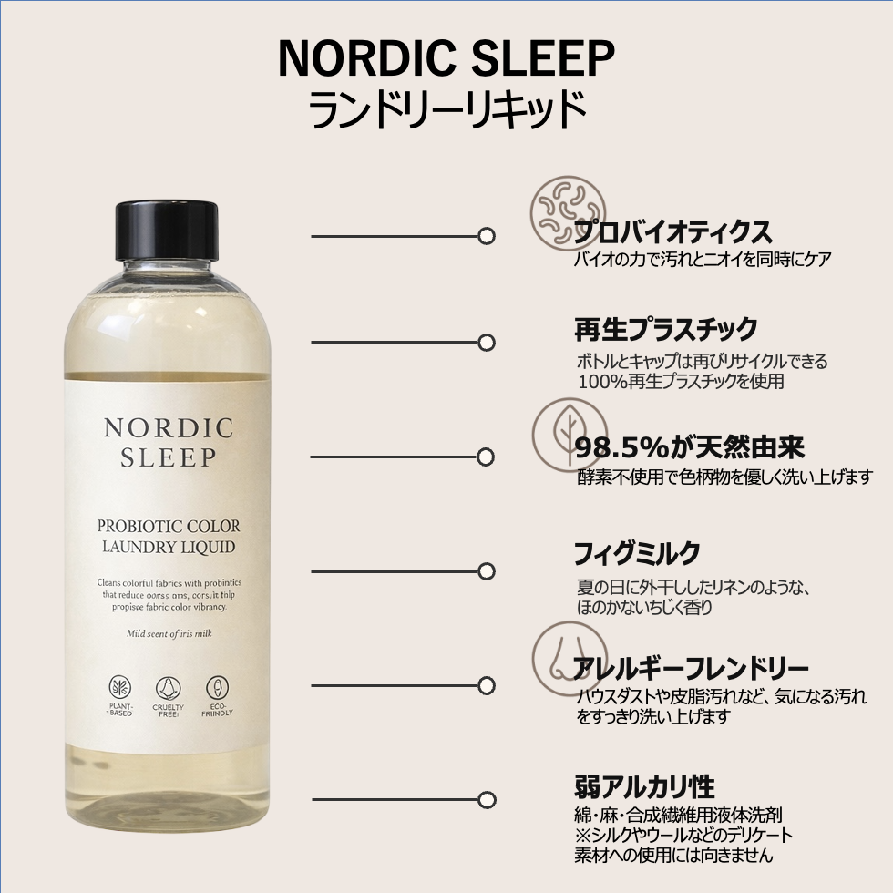 ほのかに香るいちじくの香りは、清潔感がありながらも主張しすぎず、眠りの時間を妨げません。洗うたびに、衣類やカバーの色をやさしく、そして効果的にキープしながら、日常の洗たくを心地よいひとときへと導きます。衣類やタオル、シーツやピローケースなど、肌に触れるファブリックはもちろん、枕や掛布団まで幅広く使用可能。毎日の洗たくを通して、睡眠環境そのものを整える、新しいランドリーケアの提案です。
